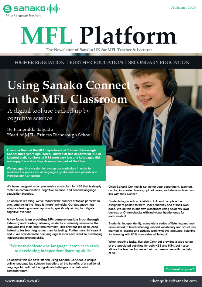 At a time when schools are increasingly being equipped with individual digital devices for learners, we can finally embrace and fully benefit from the Sanako Connect online system and supplement our offer to our learners with a modern, engaging, relevant and innovative approach to language learning.