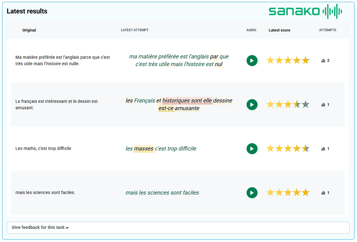 Simply paste any text into the tool, and students can then record themselves pronouncing specific sections. They'll receive immediate feedback in the form of a zero to five-star rating, along with highlighted errors and unlimited opportunities to re-record and improve.
