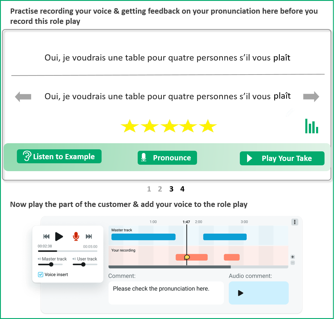 Well, you can type in a word, phrase or sentence, or even a paragraph (although it will split this up into individual sentences). The student can listen to an example of correct pronunciation at a variety of speeds, including slowed down to 1.25x the normal speed and either a male or female voice. They then record their own version, and they will be given feedback on the accuracy of their pronunciation in the form of zero to five stars
