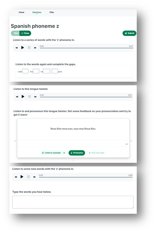 Copy & paste, or free type, text from any source to create an engaging exercise for your whole class simultaneously. Choose one of the 16 authentic voice packs available & share with your students, either in class or at home. Students listen, speak & repeat receiving instant feedback.
