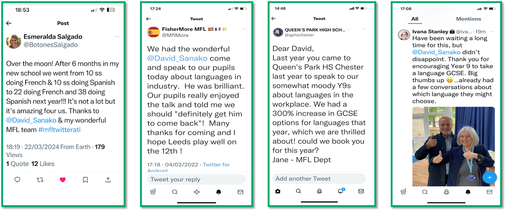 Every school which David has visited has seen improved take up of languages at options time. The talk was so popular and additional six schools signed up for a visit.