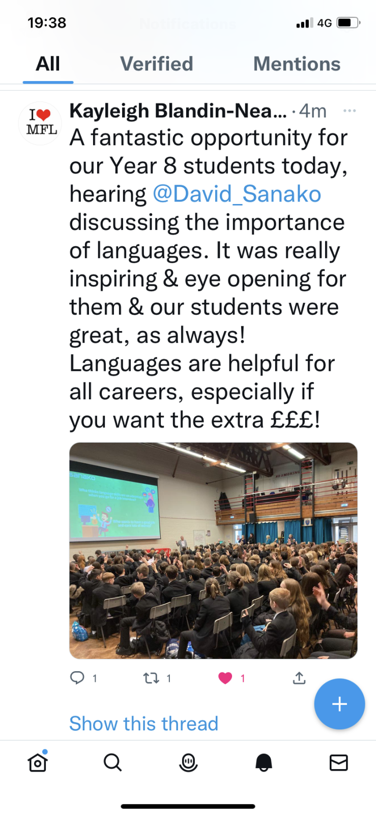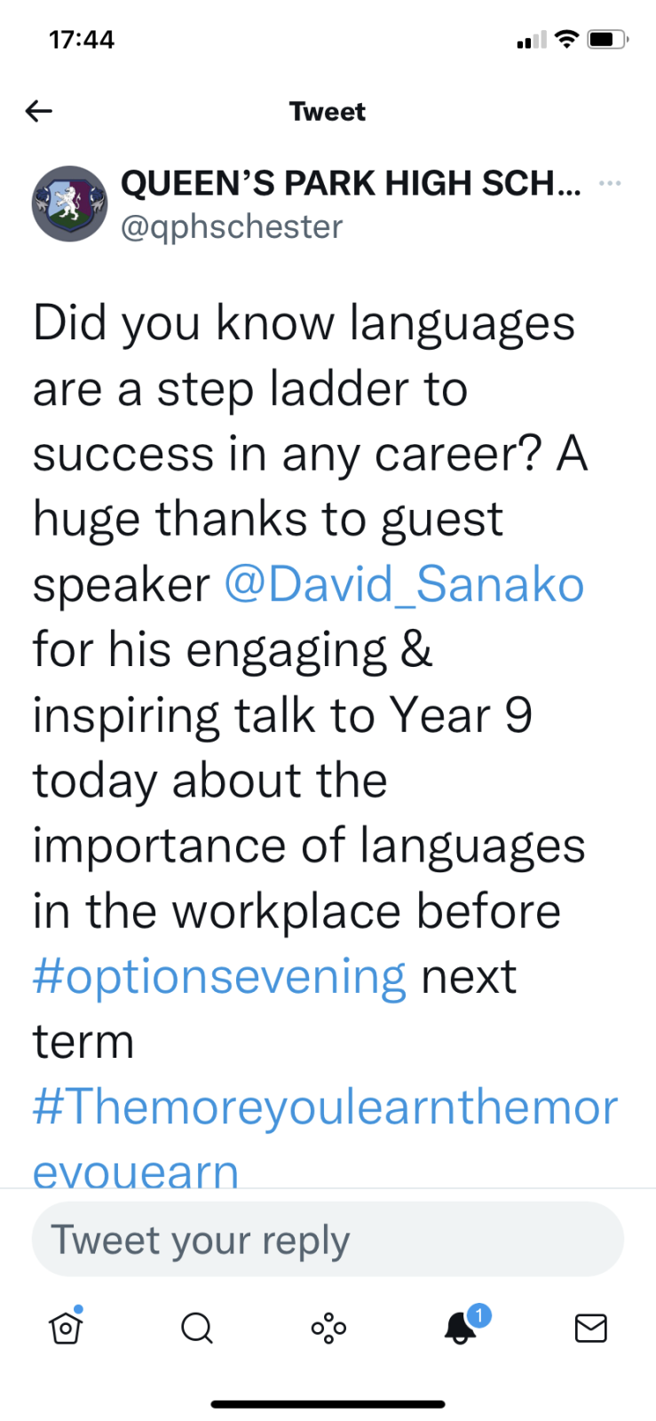 “You may remember coming to Queen’s Park High School in Chester last year to speak to our somewhat moody Year 9s about languages in the workplace.