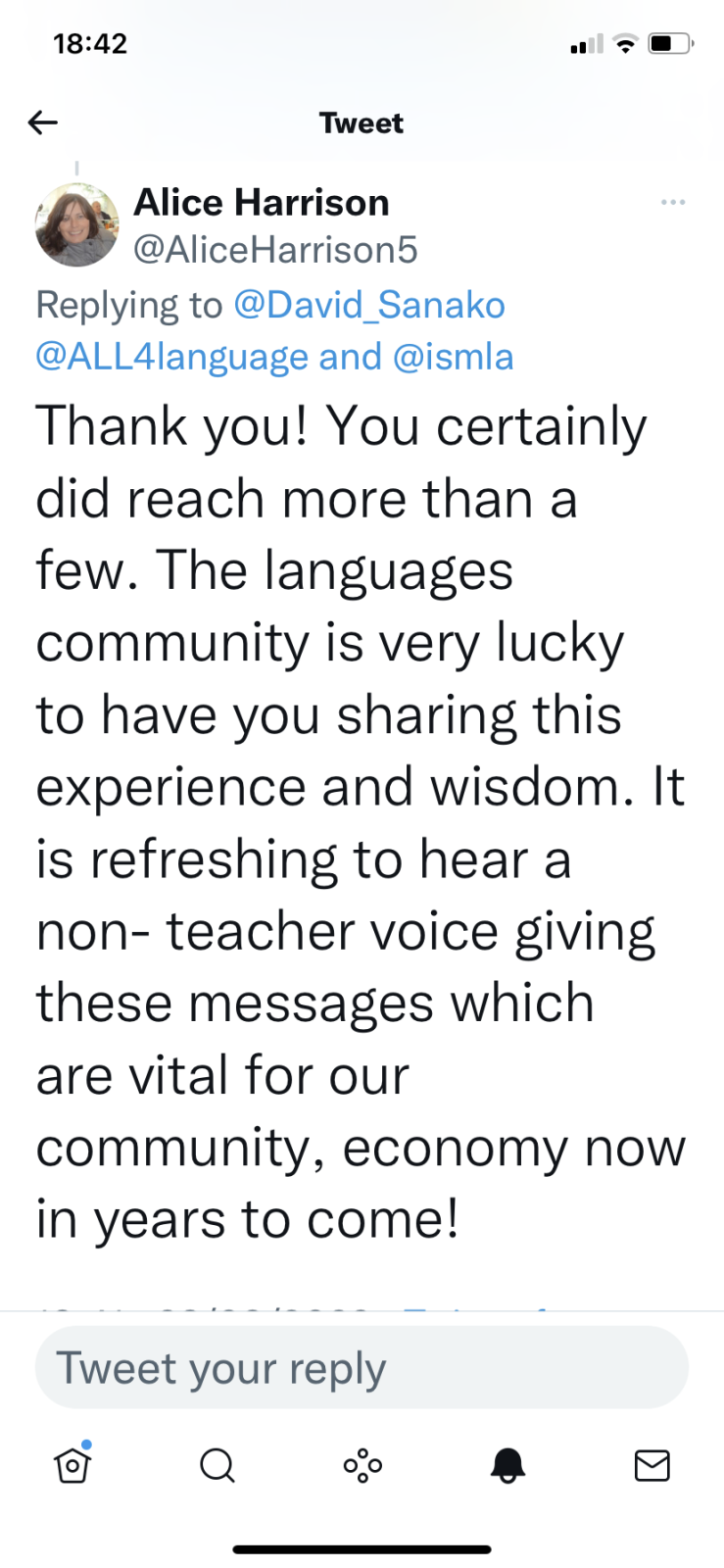 “The languages community is very lucky to have you sharing this experience and wisdom. It is refreshing to hear a non-teacher voice giving these messages which are vital for our community and economy now and in years to come!”