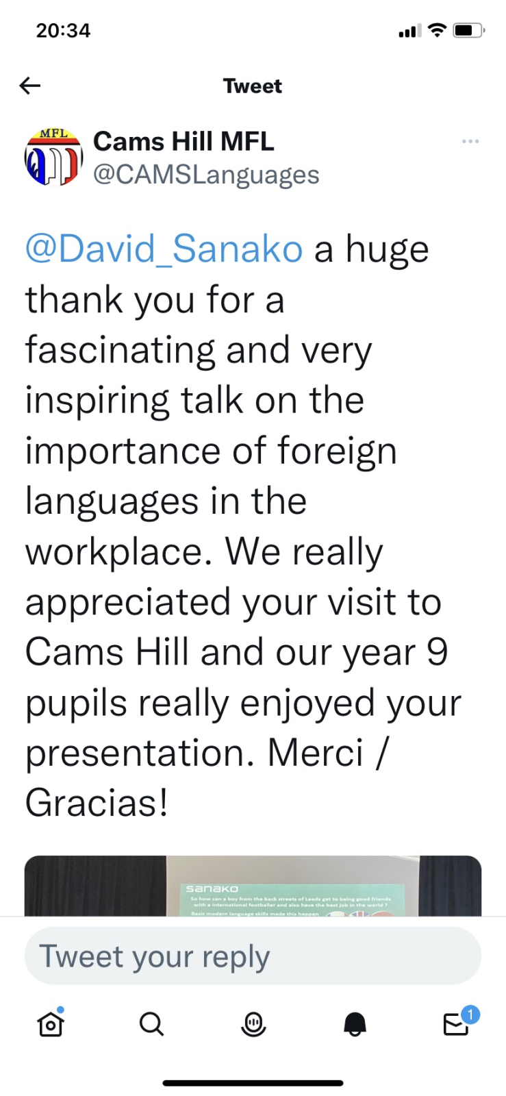 I would just like to say, on behalf of Stockport Academy, Year 9 and the MFL Department thank you so much for your time and wise words today in your inspirational talk today.