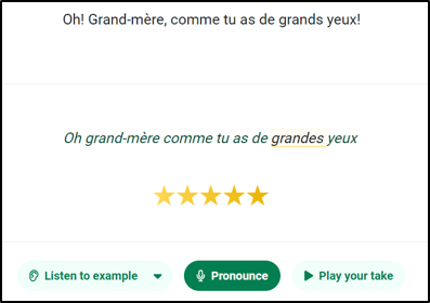 A really exciting use of MFL technology was the fact that children used Sanako Connect software to help children to practise and improve their pronunciation independently in class and at home without the need for their teachers or parents to support them. Children had opportunities, in whichever role they were assigned (big bad wolf, ugly sister and so on) to practise their lines using the latest voice recognition technology which gives feedback on a zero to five star system and even underlines which words were mispronounced. Of course, children have the opportunity to listen to a native speaker saying this correctly first, and they can slow this down to 0.75 speed, in order to be able to copy a correct model.