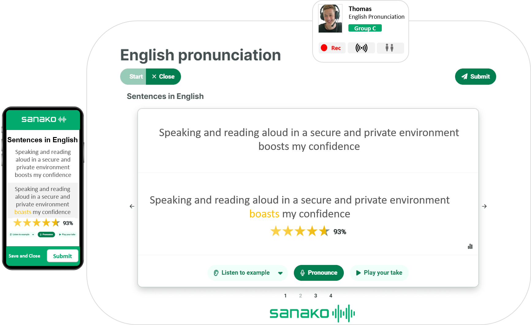 With features such as simultaneous whole-class speaking and listening assignments, engaging live pair/group discussion and role-play activities, automated pronunciation grading, and seamless student recording and feedback capabilities, Sanako Connect empowers you to efficiently guide your students toward fluency.