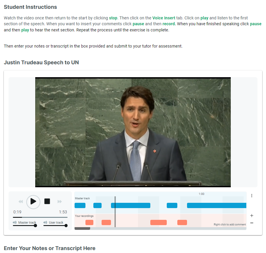 - Automatic Voice Insert feature allowing students to answer pre-recorded questions at their own pace along with transcript & interpreting practice for independent role play practice.